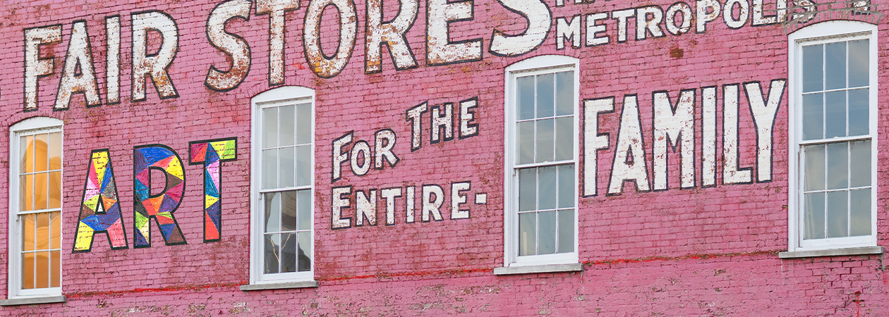 Inspired by the faded Finkel’s ghost paint on the side of our building (“Shoes for the Entire Family”), we’re reimagining the message as ART for the Entire Family. Now we’re inviting you to create your own version of the word ART in your style, your medium, and your imagination.