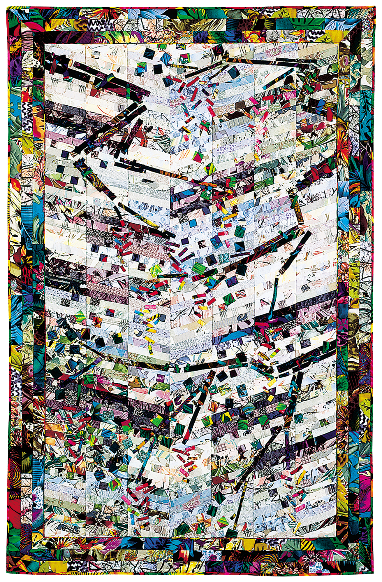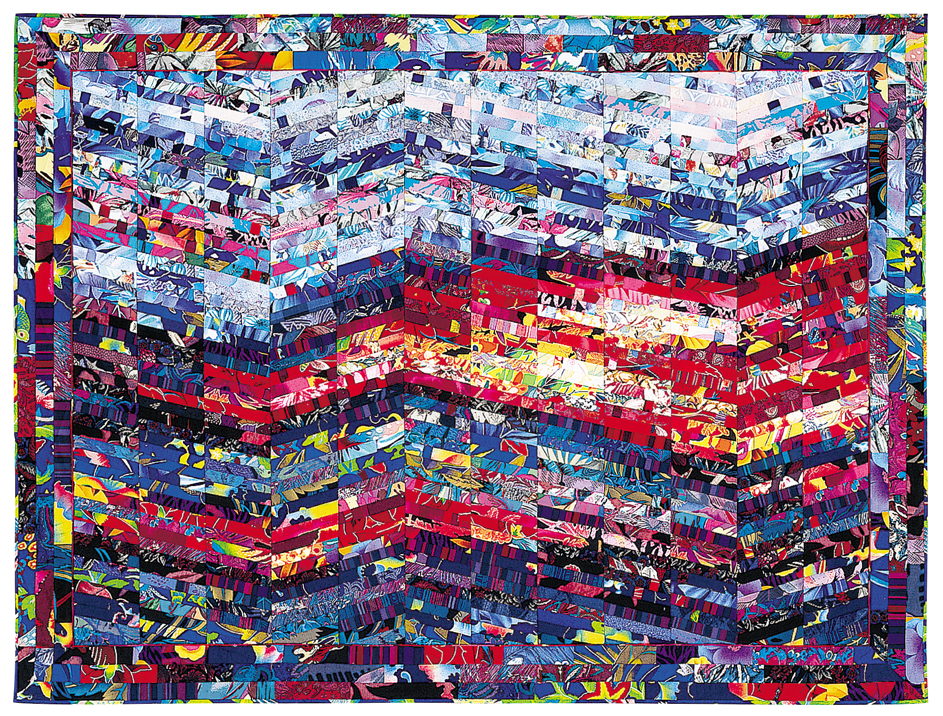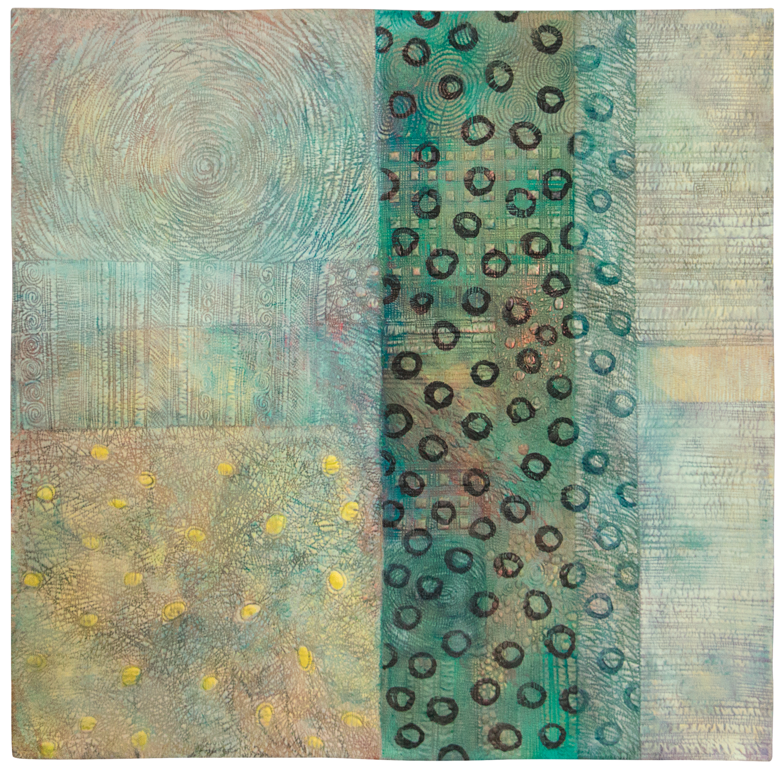 Submergence is one of my water quilts, suggesting through color the attractiveness of ocean, the desire to explore its mystery. Though the water’s surface seems just within hand’s reach, the depths hold our attention. However, not being a swimmer, I’ve experience being caught underwater and needing to be fished out. The water’s surface was bright with sunlight, but, to me, unattainable. Yet when I look at Submergence I can imagine being surrounded by water and unafraid.