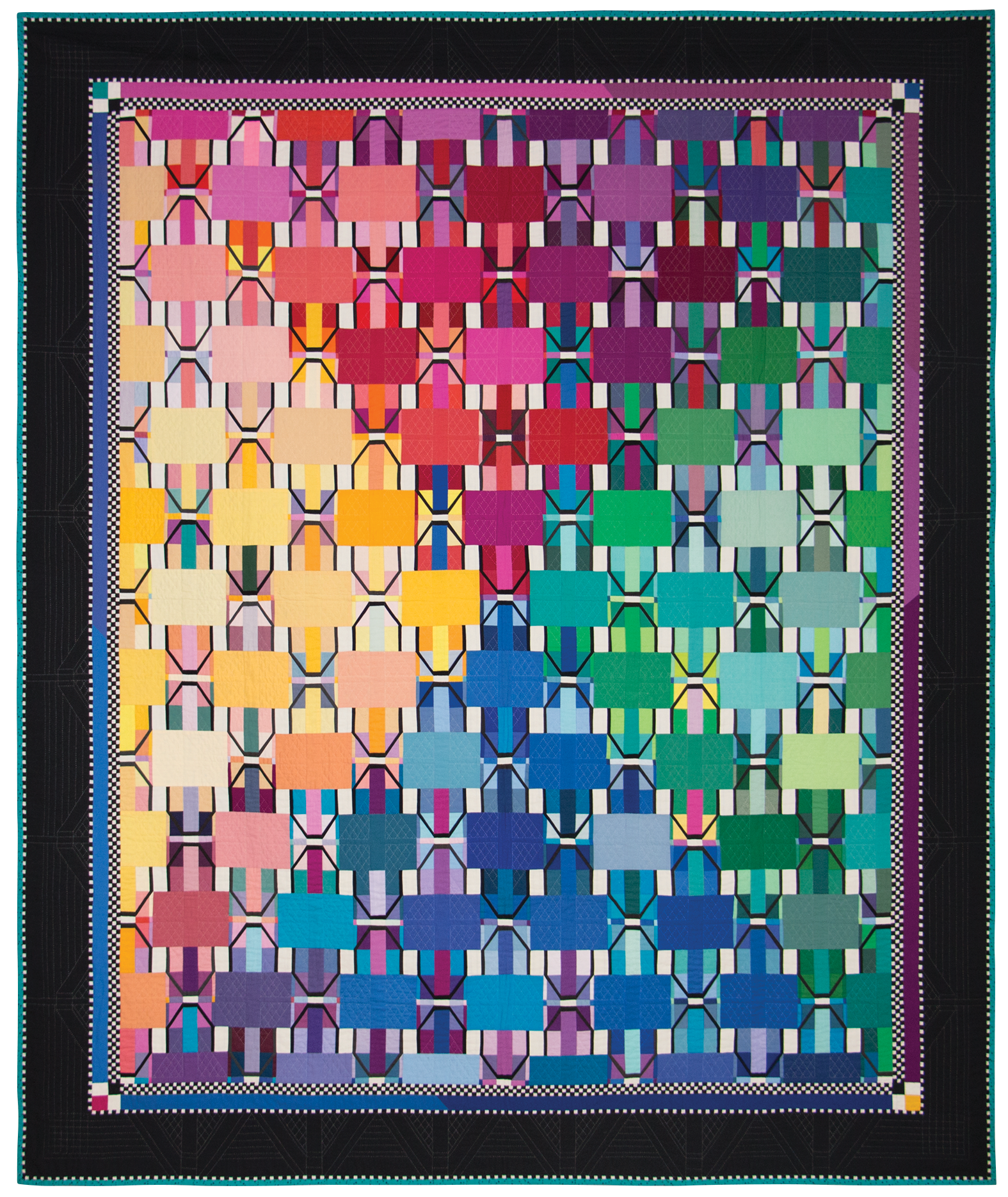 This quilt is a twist on the Friendship Quilt—of the 132 4” blocks, the colors for 55 were selected by 55 friends, who without seeing the design, were invited to ‘come color with me!’ The youngest was 3 years old; two are color-blind; two extreme extroverts picked the same bright yellows and oranges; and two photographers took the longest time to select their colors.
